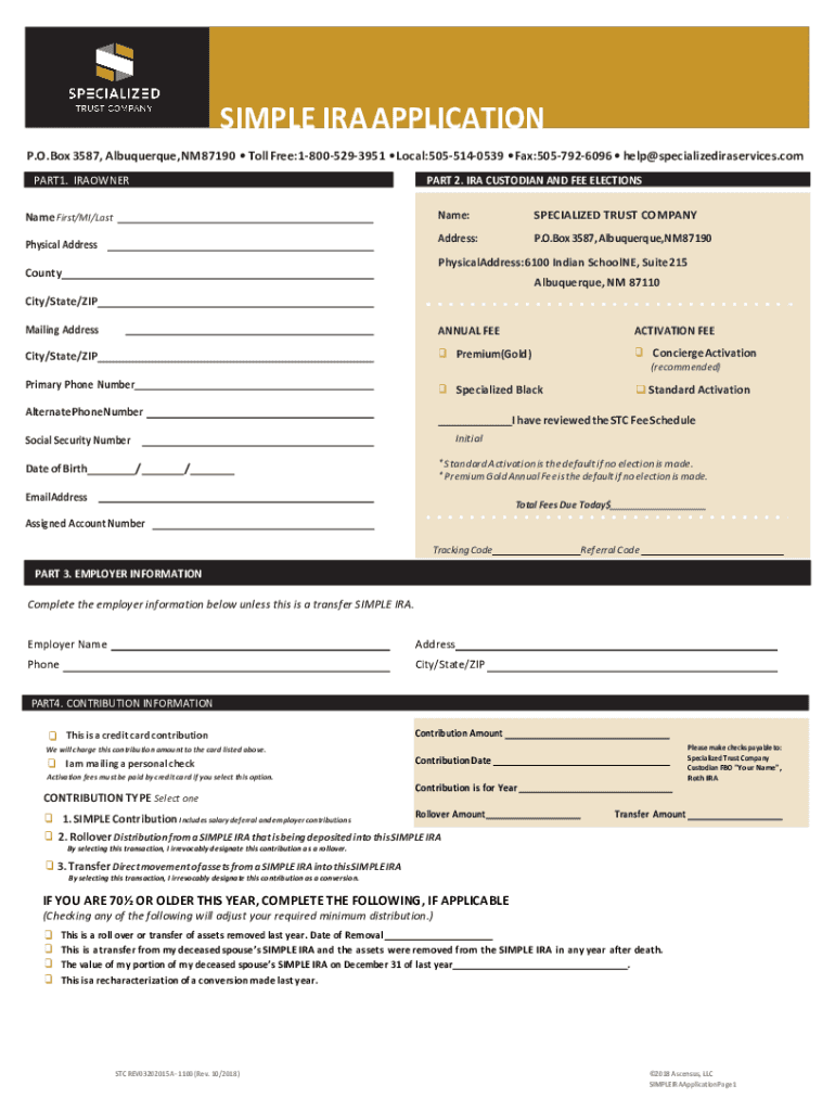 SIMPLE IRA APPLICATION P.O. Box 3587, Albuquerque, NM 87190 Toll Free: 18 005293951 Local: 5055140539 Fax: 5057926096 help@specializediraservices.com PART 2. IRA CUSTODIAN AND FEE ELECTIONSPART1.