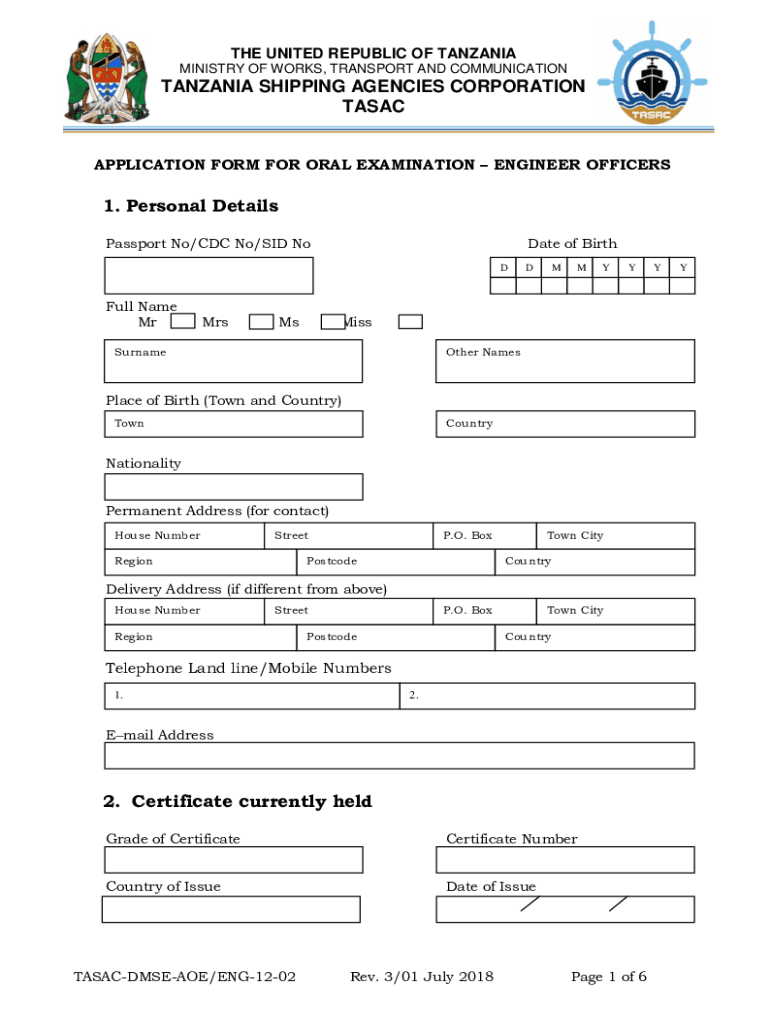 THE UNITED REPUBLIC OF TANZANIA MINISTRY OF WORKS, TRANSPORT AND COMMUNICATIONTANZANIA SHIPPING AGENCIES CORPORATION TA SAC APPLICATION FORM FOR ORAL EXAMINATION ENGINEER OFFICERS1. Personal Details