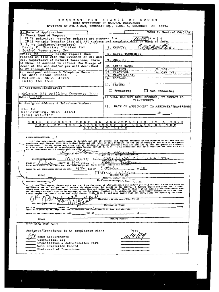 REQUEST FOR CHANGE OF OWNER OHIO DEPARTMENT OF Natural RESOURCES DIVISION OF OIL & GAS, FOUNTAIN SQ., BLDG. A, COLUMBUS OH 43224 l, Date of Application: FORM 7: Revised 06/01/81 I 2. Check Type of