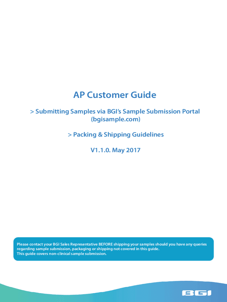 AP Customer Guide Submitting Samples via BGI Sample Submission Portal (bgisample.com) Packing & Shipping Guidelines V1.1.0. May 2017Please contact your BGI Sales Representative BEFORE shipping your