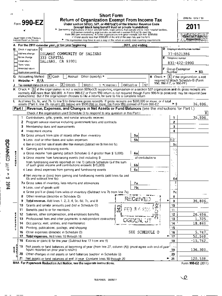 Form990EZDepartment of the Treasury Internal Revenue Service Short Form Return of Organization Exempt From Income Tax Under section 501 (c), 527, or 4947(AXL) of the Internal Revenue Code (except