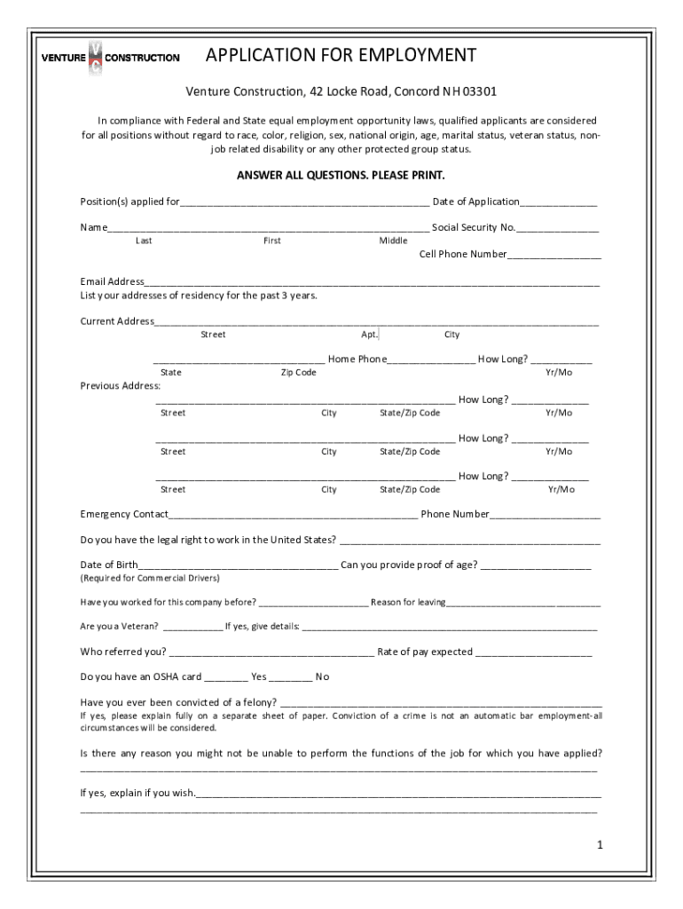APPLICATION FOR EMPLOYMENT Venture Construction, 42 Locke Road, Concord NH 03301 In compliance with Federal and State equal employment opportunity laws, qualified applicants are considered for all