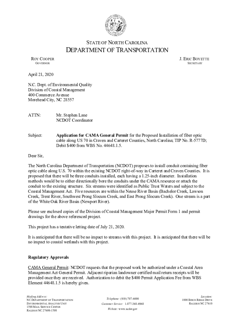 STATE OF NORTH CAROLINADEPARTMENT OF TRANSPORTATION ROY COOPER. ERIC BOYETTEGOVERNORSECRETARYApril 21, 2020 N.C. Dept. of Environmental Quality Division of Coastal Management 400 Commerce Avenue Forehead