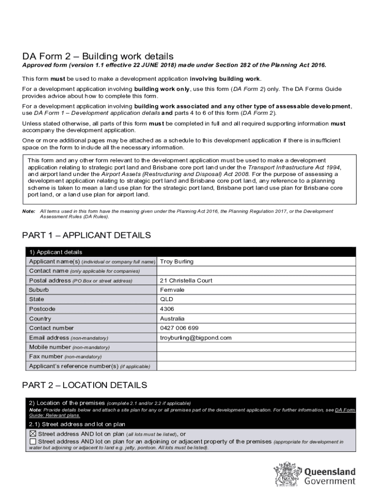 DA Form 2 Building work detailsApproved form (version 1.1 effective 22 JUNE 2018) made under Section 282 of the Planning Act 2016. This form must be used to make a development application involving