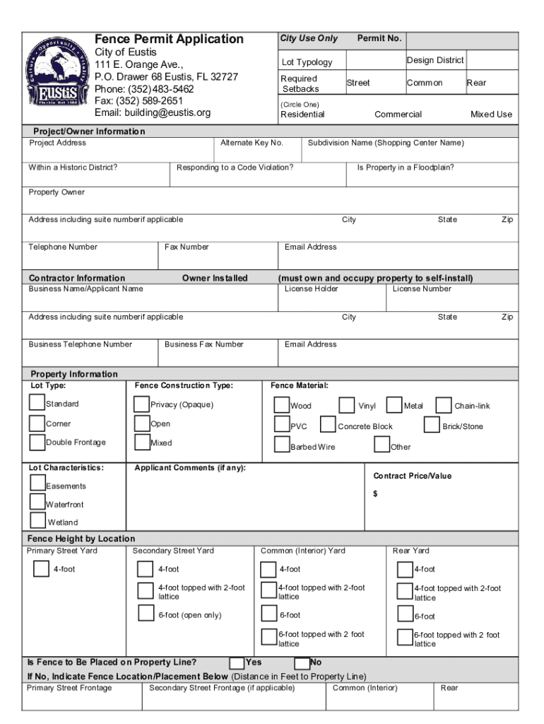 Fence Permit ApplicationCity Use Only111 E. Orange Ave., P.O. Drawer 68 Eustis, FL 32727 Phone: (352) 4835462 Fax: (352) 5892651 Email: building@eustis.orgLot TypologyCity of EustisProject/Owner InformationProject