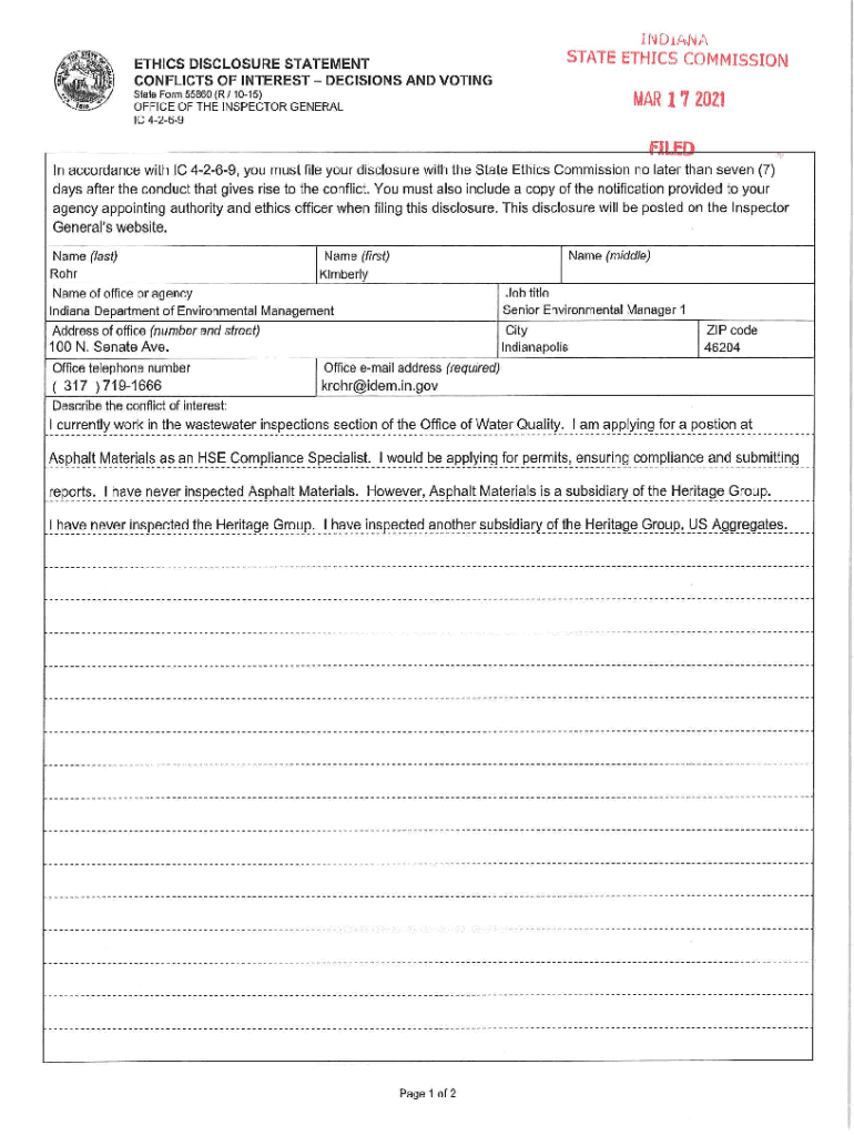 INDiANASTATE F:THT CS COMMISSIONETHICS DISCLOSURE STATEMENT CONFLICTS OF INTEREST DECISIONS AND VOTING MAR 11 202.1State Form 55860 (R/1015)OFFICE OF THE INSPECTOR GENERAL 1C 4269In accordance with