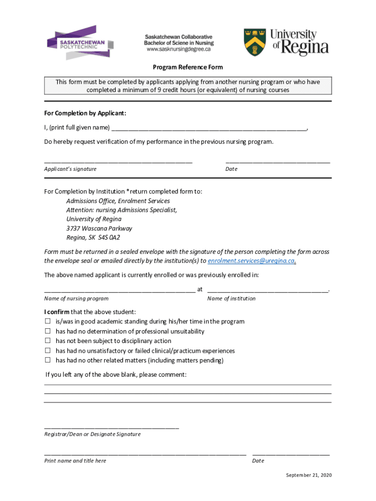 Program Reference Form This form must be completed by applicants applying from another nursing program or who have completed a minimum of 9 credit hours (or equivalent) of nursing courses For Completion