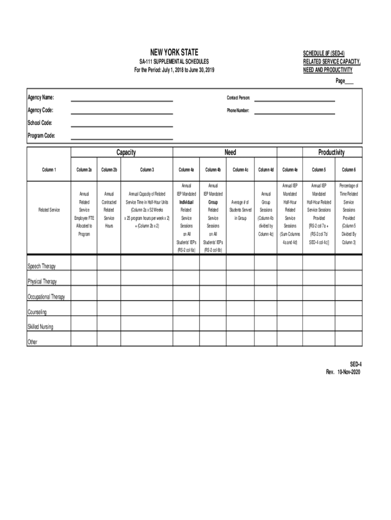 NEW YORK STATESCHEDULE 8F (SED4) RELATED SERVICE CAPACITY, NEED AND PRODUCTIVITYSA111 SUPPLEMENTAL SCHEDULES For the Period: July 1, 2018, to June 30, 2019Page Agency Name:Contact Person:Agency Code:Phone