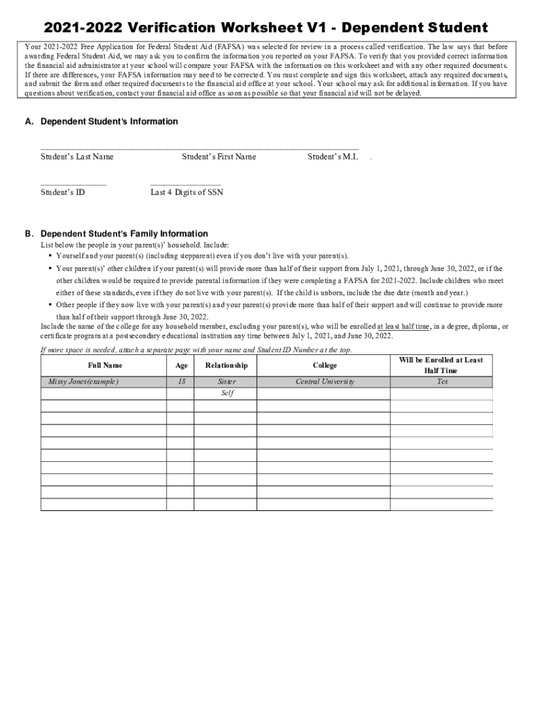 20212022 Verification Worksheet V1 Dependent Student Your 20212022 Free Application for Federal Student Aid (FAFSA) was selected for review in a process called verification. The law says that before