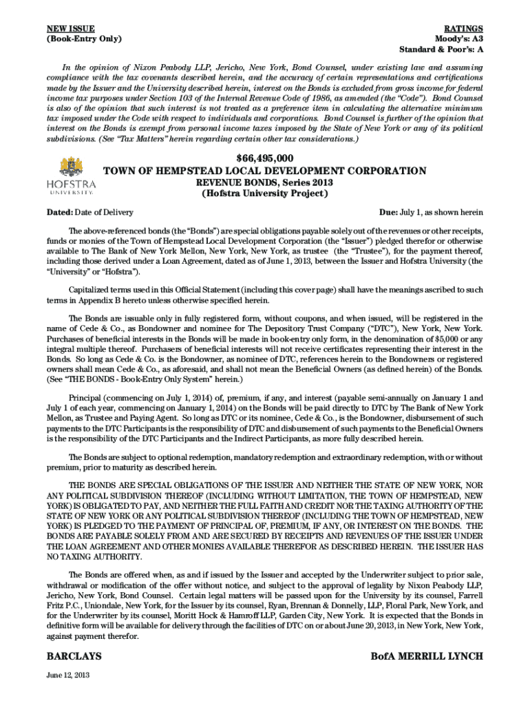 NEW ISSUE(Coventry Only)RATINGS Moody's: A3 Standard & Poor: Ain the opinion of Nixon Peabody LLP, Jericho, New York, Bond Counsel, under existing law and assuming compliance with the tax covenants