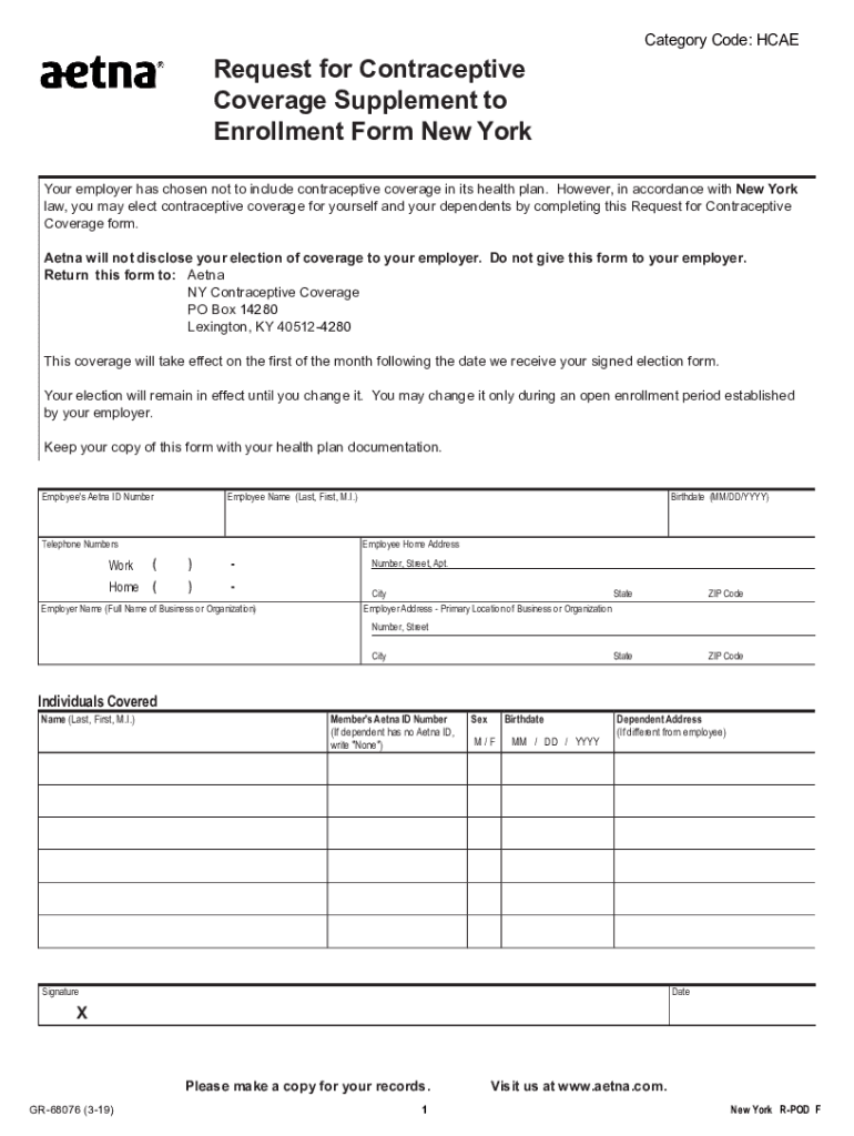 Category Code: HCAERequest for Contraceptive Coverage Supplement to Enrollment Form New York Your employer has chosen not to include contraceptive coverage in its health plan. However, in accordance