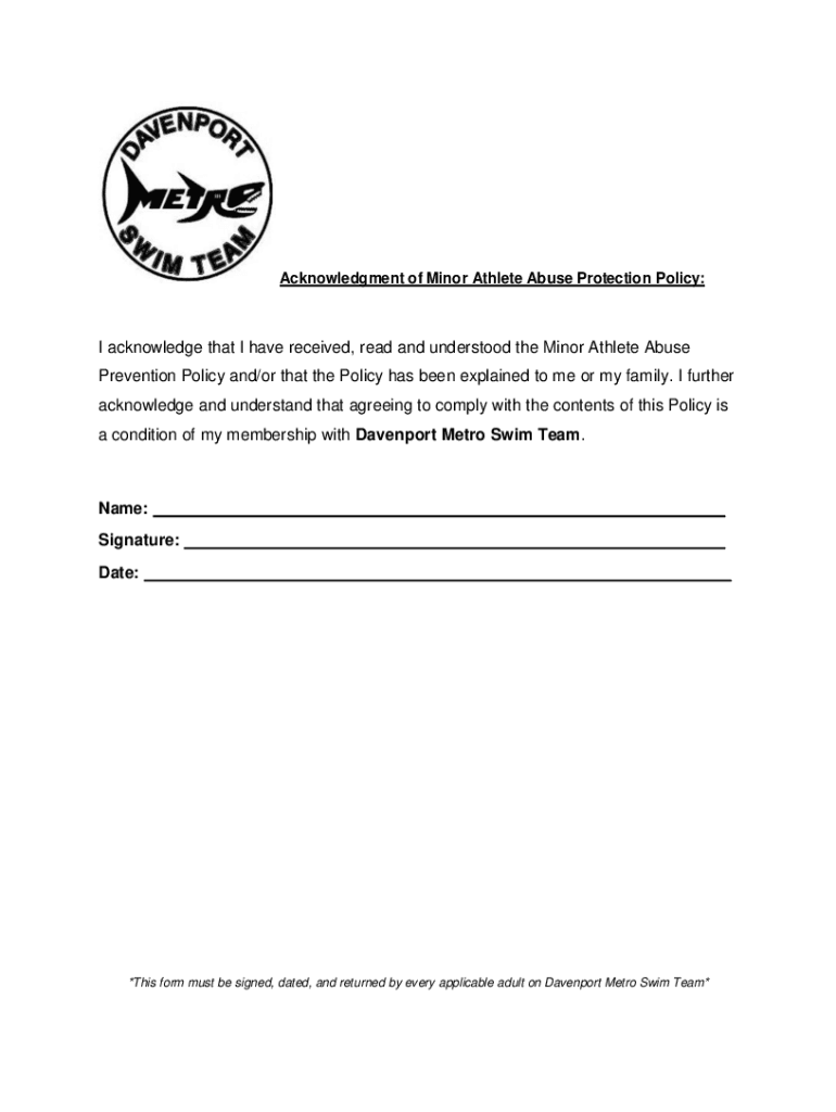 Acknowledgment of Minor Athlete Abuse Protection Policy:I acknowledge that I have received, read and understood the Minor Athlete Abuse Prevention Policy and/or that the Policy has been explained