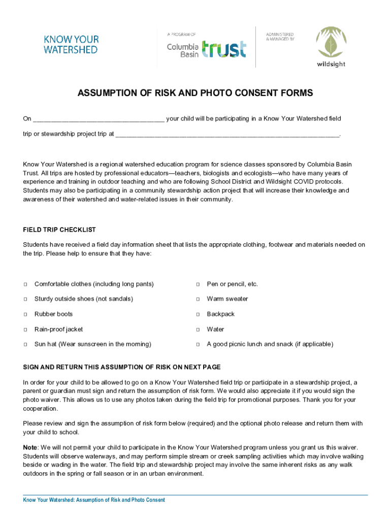ASSUMPTION OF RISK AND PHOTO CONSENT FORMS On your child will be participating in a Know Your Watershed field trip or stewardship project trip at. Know Your Watershed is a regional watershed education