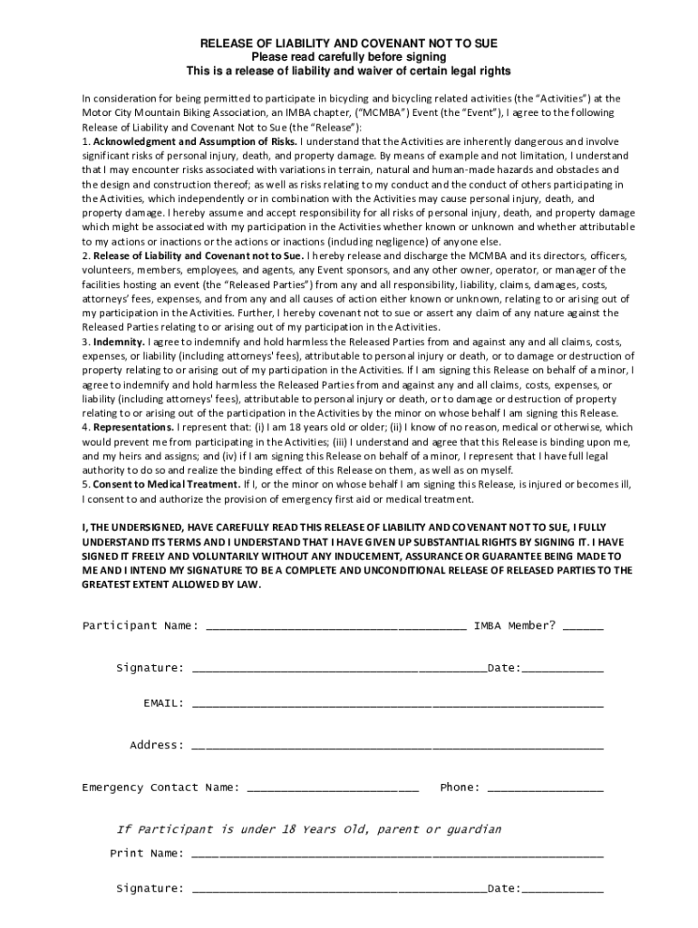 RELEASE OF LIABILITY AND COVENANT NOT TO SUE Please read carefully before signing This is a release of liability and waiver of certain legal rights In consideration for being permitted to participate