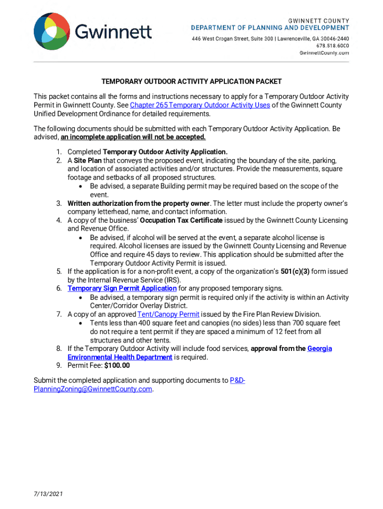 TEMPORARY OUTDOOR ACTIVITY APPLICATION PACKET This packet contains all the forms and instructions necessary to apply for a Temporary Outdoor Activity Permit in Gwinnett County. See Chapter 265 Temporary