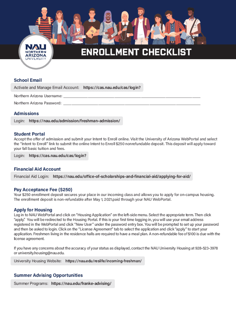 ENROLLMENT CHECKLIST School Email Activate and Manage Email Account:https://cas.nau.edu/cas/login? Northern Arizona Username: Northern Arizona Password: Admissions Login:https://nau.edu/admission/freshmanadmission/Student