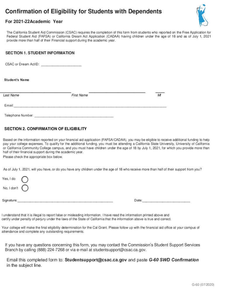 Confirmation of Eligibility for Students with Dependents For 202122 Academic Year The California Student Aid Commission (CSA) requires the completion of this form from students who reported on the