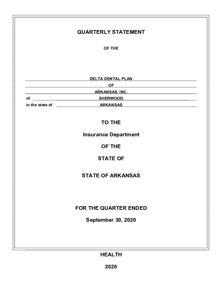 QUARTERLY STATEMENT OF DELTA DENTAL PLAN OF ARKANSAS, INC. ofSHERWOODin the state ofARKANSASTO THE Insurance Department OF THE STATE OF ARKANSAS THE QUARTER ENDED September 30, 2020HEALTH 202047155202020100103QUARTERLY