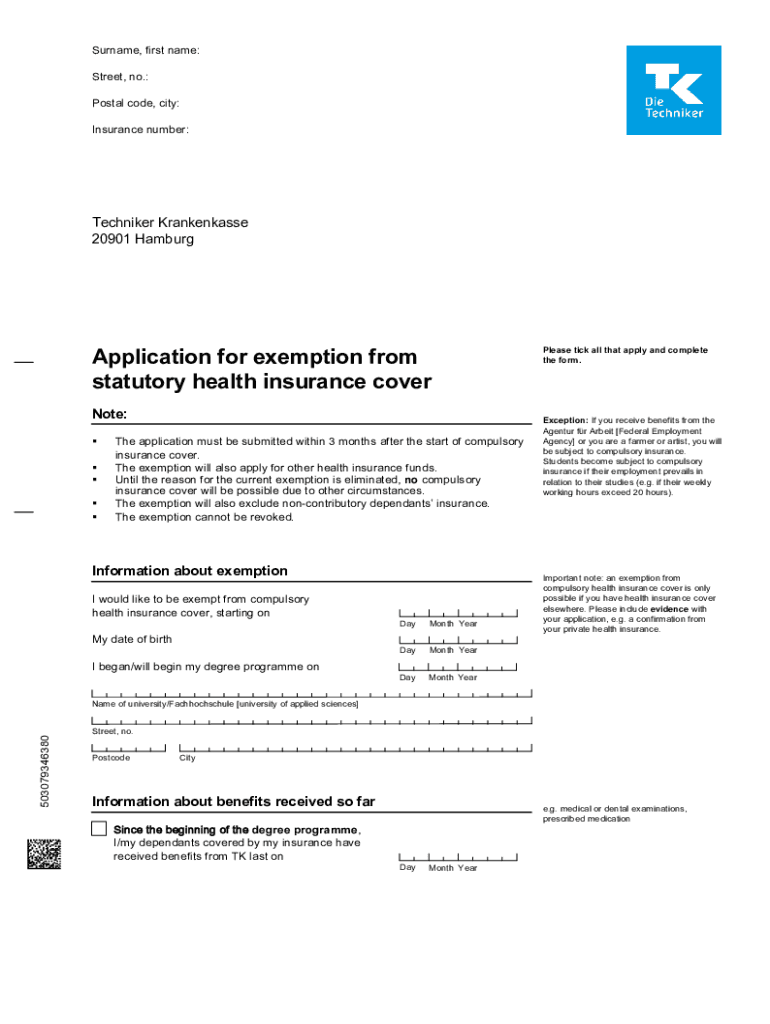 Surname, first name: Street, no.: Postal code, city: Insurance number:Technical Krankenkasse 20901 HamburgApplication for exemption from statutory health insurance cover Note: The application must