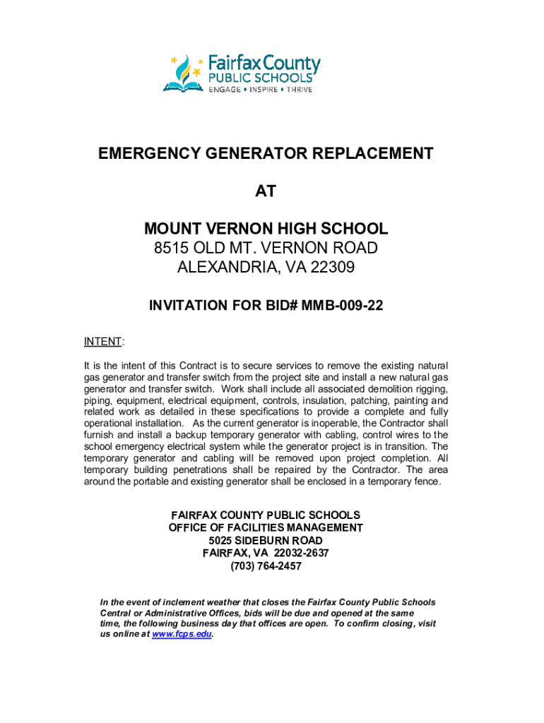 EMERGENCY GENERATOR REPLACEMENT AT MOUNT VERNON HIGH SCHOOL 8515 OLD MT. VERNON ROAD ALEXANDRIA, VA 22309 INVITATION FOR BID# MMB00922 INTENT: It is the intent of this Contract is to secure services