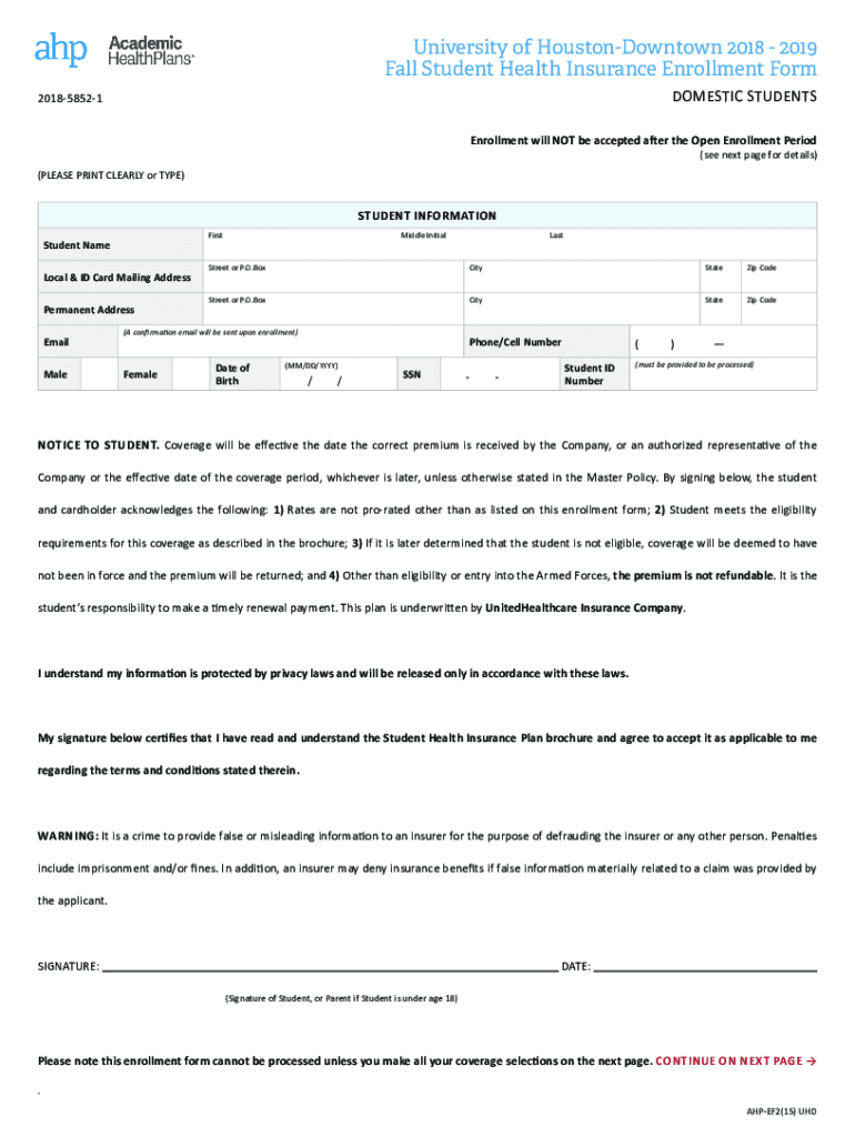 University of HoustonDowntown 2018 2019 Fall Student Health Insurance Enrollment Form DOMESTIC STUDENTS201858521Enrollment will NOT be accepted after the Open Enrollment Period (see next page for