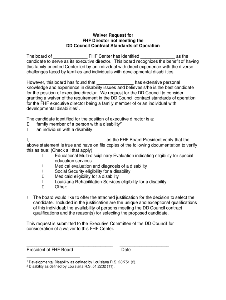 Get the free Waiver Request for FHF Director that does not meet the DD Council Contract standards