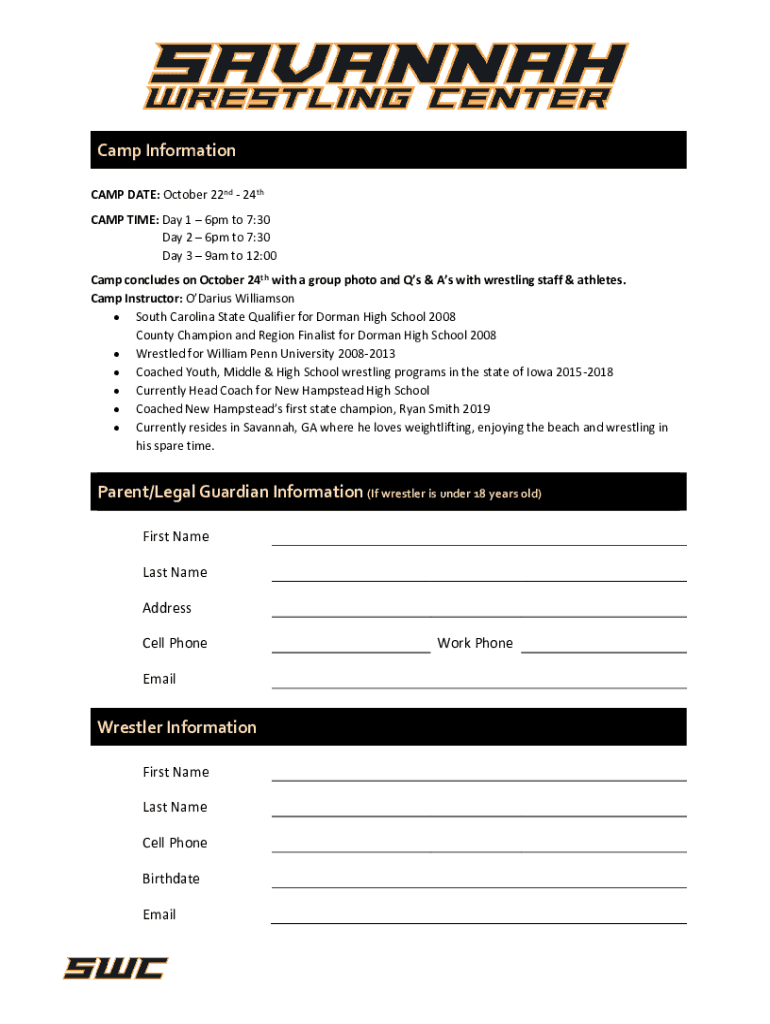 Camp Information CAMP DATE: October 22nd 24th CAMP TIME: Day 1 6pm to 7:30 Day 2 6pm to 7:30 Day 3 9am to 12:00 Camp concludes on October 24th with a group photo and QS & As with wrestling staff &