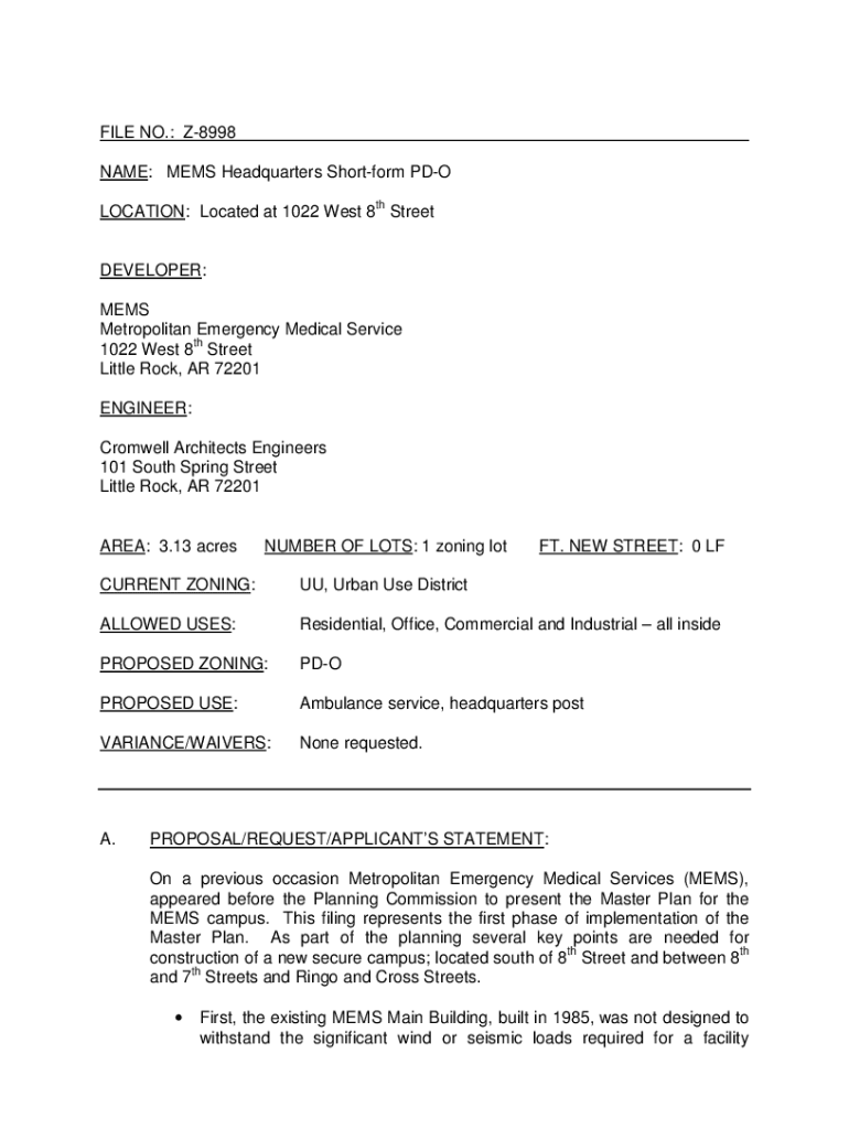 FILE NO.: Z8998 NAME: MEMO Headquarters Short form PDO LOCATION: Located at 1022 West 8th Street DEVELOPER: MEMO Metropolitan Emergency Medical Service 1022 West 8th Street Little Rock, AR 72201 ENGINEER: