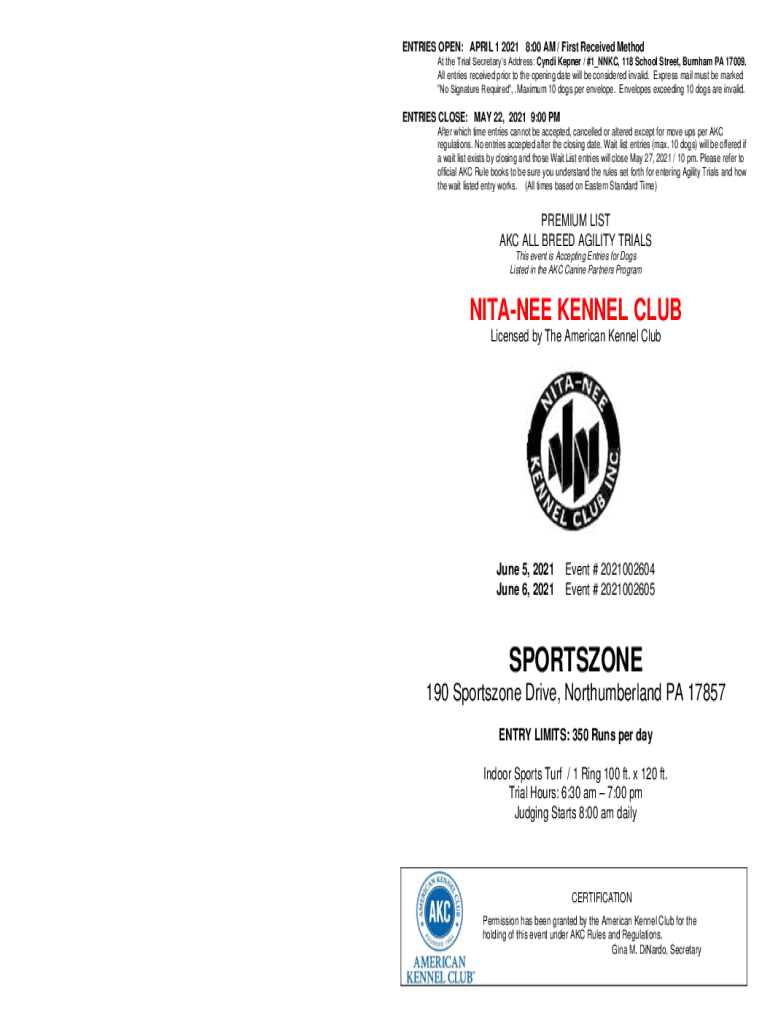 ENTRIES OPEN: APRIL 1, 2021 8:00 AM / First Received Method At the Trial Secretary's Address: Hindi Kepler / #1_INK, 118 School Street, Burnham PA 17009. All entries received prior to the opening