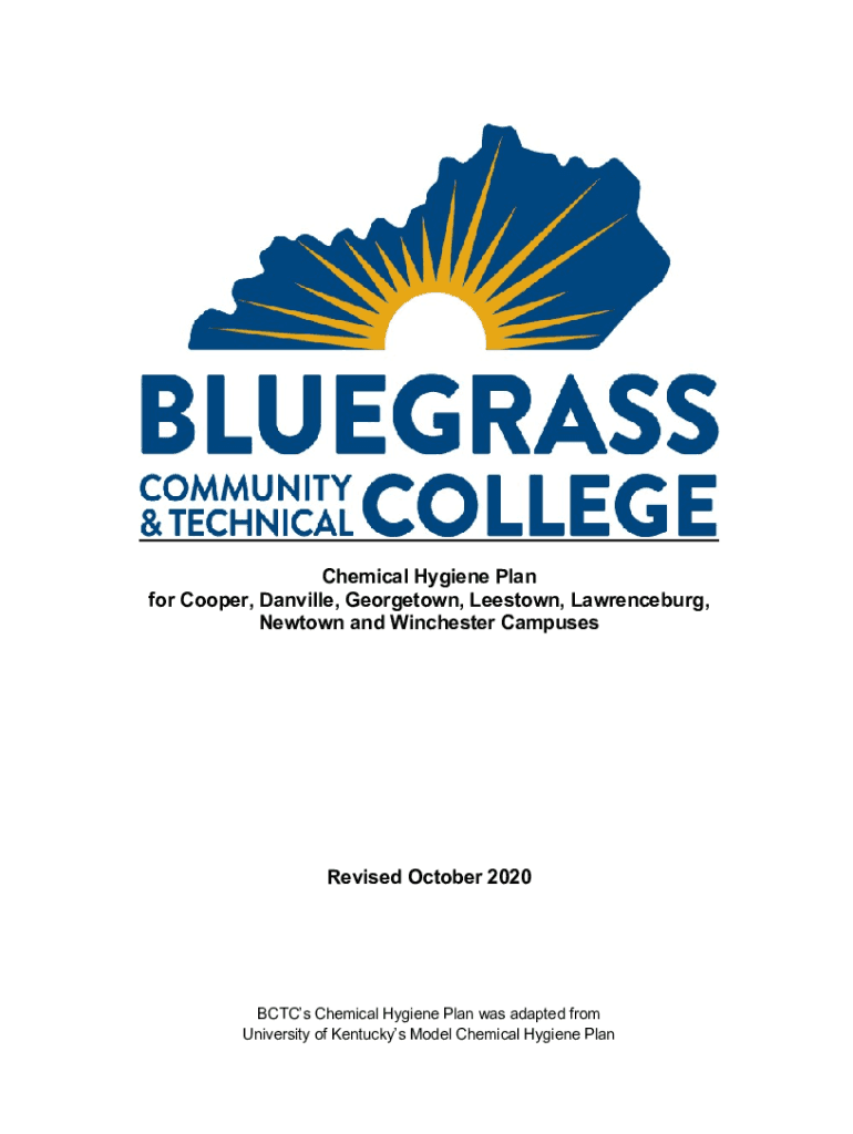 Chemical Hygiene Plan for Cooper, Danville, Georgetown, Lees town, Lawrence burg, Newton and Winchester CampusesRevised October 2020BCTCs Chemical Hygiene Plan was adapted from University of Kentucky's