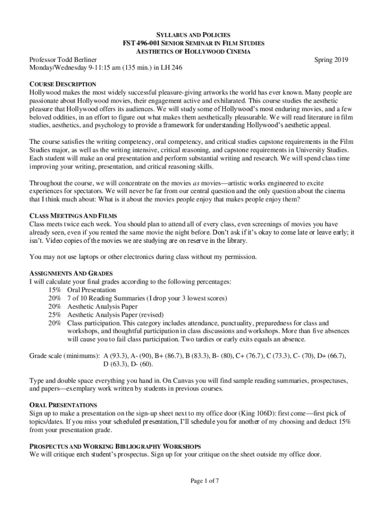 Get the free SYLLABUS AND POLICIES FST 496-001 SENIOR SEMINAR IN FILM ... - people uncw