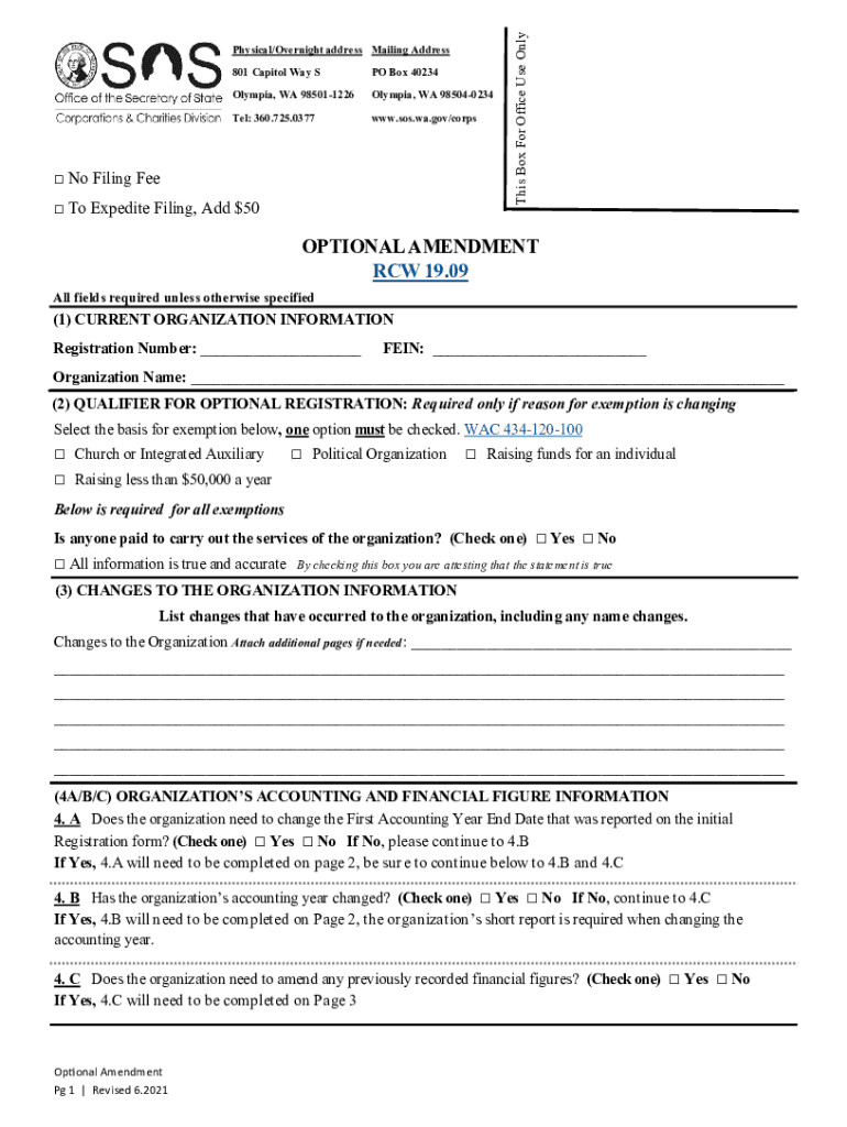 Corporations & Charities Division Physical/Overnight address: 801 Capitol Way S Olympia, WA 985011226 Mailing address: PO Box 40234 Olympia, WA 985040234 Tel: 360.725.0377 sos.wa.gov/corpsINSTRUCTIONS: