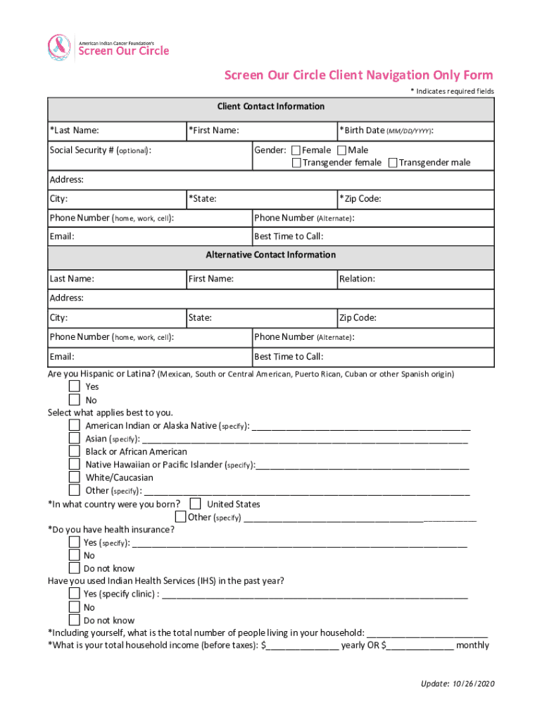 Screen Our Circle Client Navigation Only Form * Indicates required fieldsClient Contact Information *Last Name:*First Name:Social Security # (optional):*Birth Date (MM/DD/YYY): Gender: Female Male