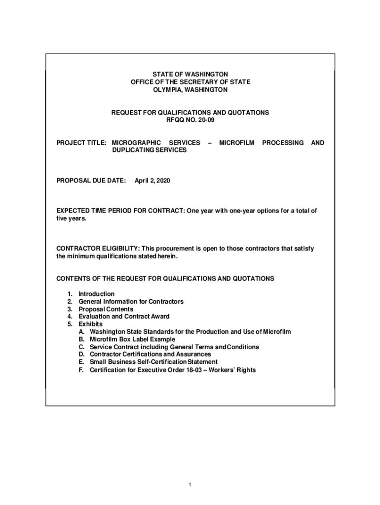 STATE OF WASHINGTON OFFICE OF THE SECRETARY OF STATE OLYMPIA, WASHINGTONREQUEST FOR QUALIFICATIONS AND QUOTATIONS RFQ NO. 2009PROJECT TITLE: MICROGRAPH IC SERVICES DUPLICATING SERVICESPROPOSAL DUE
