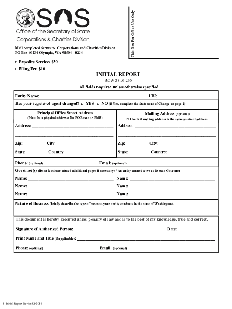 This Box For Office Use Olympic completed forms to: Corporations and Charities Division PO Box 40234 Olympia, WA 98504 0234 Expedite Services $50 Filing Fee $10INITIAL REPORT RCW 23.95.255 All fields