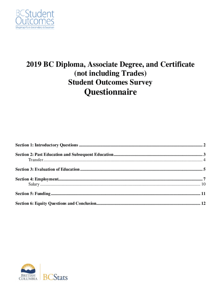 2019 BC Diploma, Associate Degree, and Certificate (not including Trades) Student Outcomes SurveyQuestionnaireSection 1: Introductory Questions ..................................................................................................................