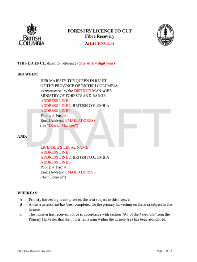 FORESTRY License TO CUT Fiber Recovery A(License#) !!THIS License, dated for reference (date with 4 digit year). BETWEEN: HER MAJESTY THE QUEEN IN RIGHT OF THE PROVINCE OF BRITISH COLUMBIA, as represented