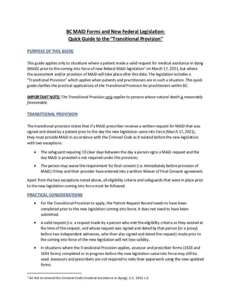 BC Maid Forms and New Federal Legislation: Quick Guide to the Transitional Provision PURPOSE OF THIS GUIDE applies only to situations where a patient made a valid request for medical assistance in