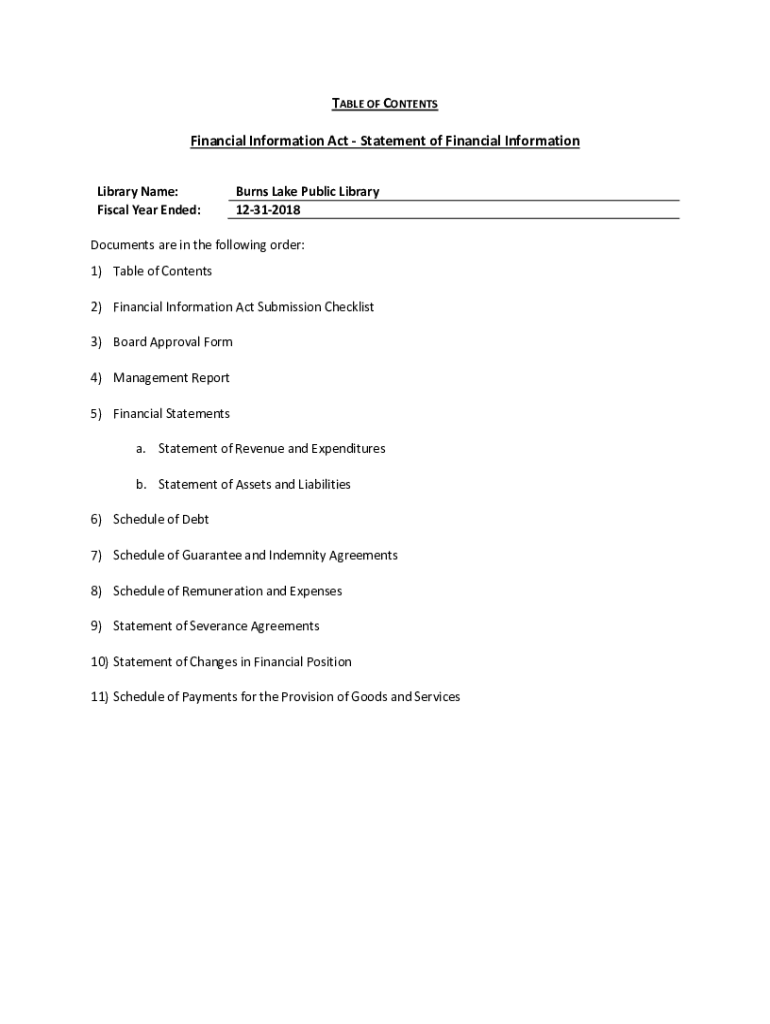 TABLE OF CONTENTS Financial Information Act Statement of Financial Information Library Name: Fiscal Year Ended:Burns Lake Public Library 12312018Documents are in the following order: 1) Table of Contents