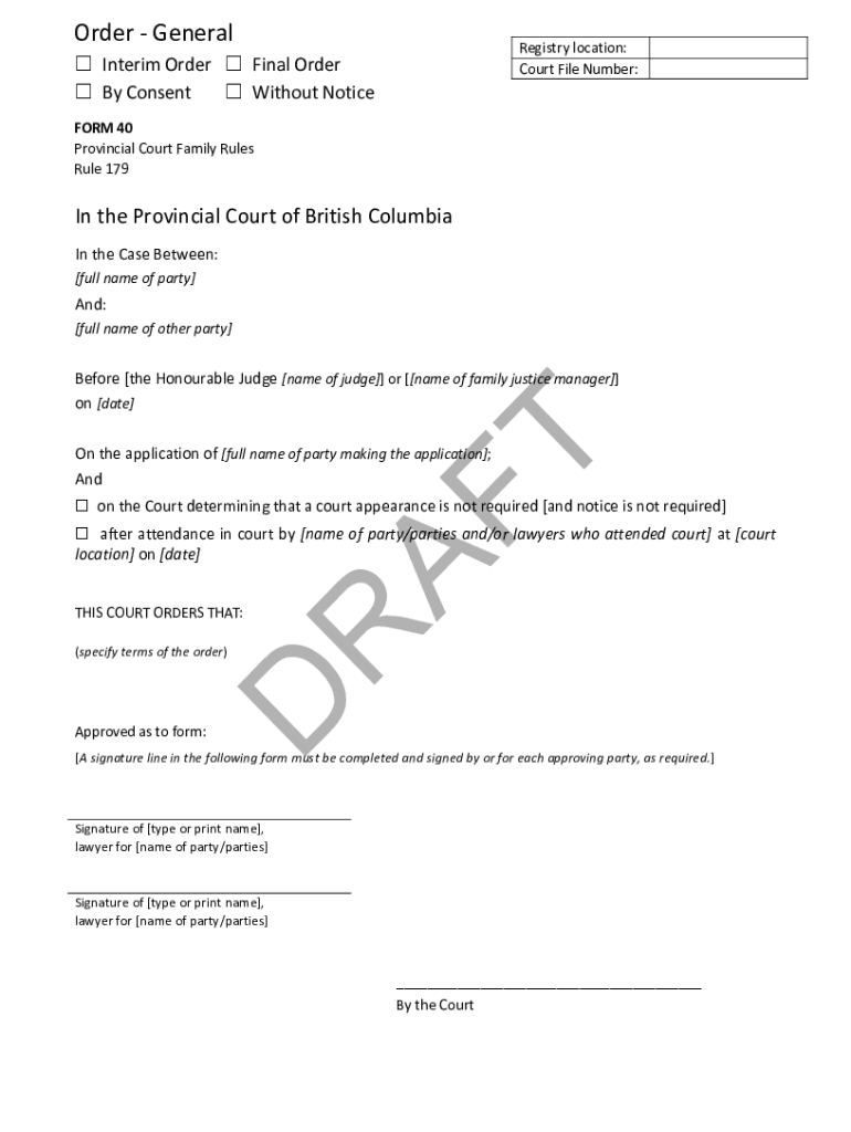 Order GeneralRegistry location: Court File Number: Interim Order Final Order By Consent Without Notice FORM 40 Provincial Court Family Rules Rule 179In the Provincial Court of British Columbia In