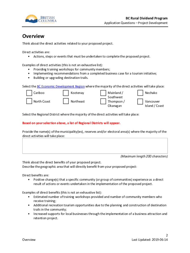 BC Rural Dividend ProgramApplication Questions Project Development This information is designed to assist applicants in successfully preparing their applications for the Project Development (up to
