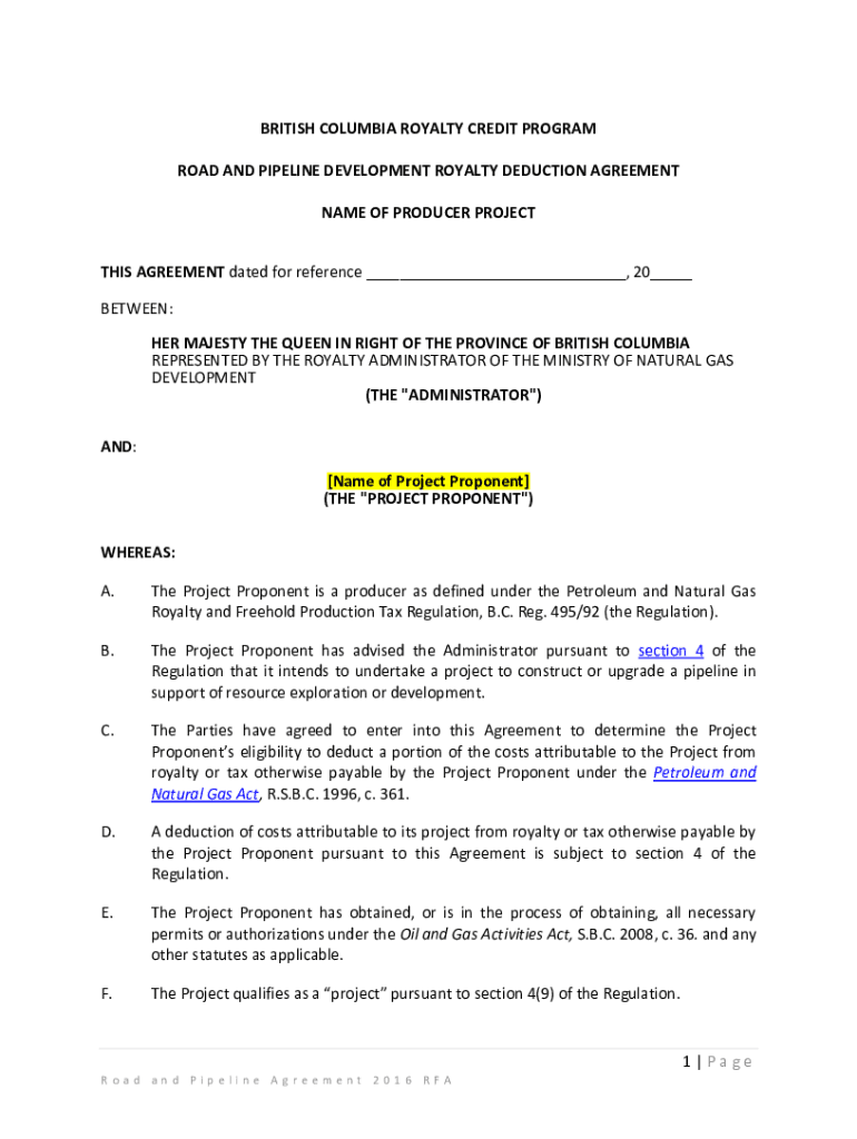 BRITISH COLUMBIA ROYALTY CREDIT PROGRAM ROAD AND PIPELINE DEVELOPMENT ROYALTY DEDUCTION AGREEMENT NAME OF PRODUCER PROJECT THIS AGREEMENT dated for reference, 20 BETWEEN: HER MAJESTY THE QUEEN IN