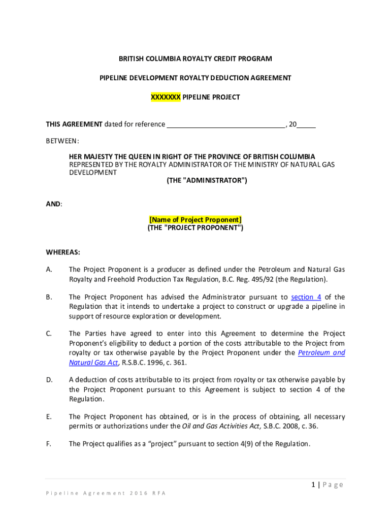 BRITISH COLUMBIA ROYALTY CREDIT PROGRAM PIPELINE DEVELOPMENT ROYALTY DEDUCTION AGREEMENT XXXIX PIPELINE PROJECT THIS AGREEMENT dated for reference, 20 BETWEEN: HER MAJESTY THE QUEEN IN RIGHT OF THE