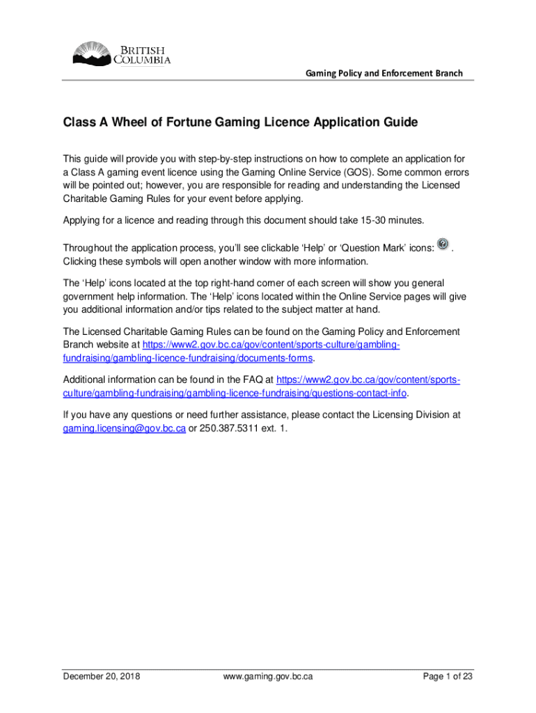 Gaming Policy and Enforcement BranchClass A Wheel of Fortune Gaming License Application Guide This guide will provide you with stepsister instructions on how to complete an application for a Class
