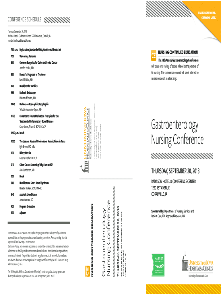 CONFERENCE SCHEDULE Thursday, September 20, 2018, Radisson Hotel & Conference Center, 1220 1st Avenue, Colville, IA Intended Audience: Licensed Nurses 7:30 a.m. Registration/Vendor Exhibits/Continental