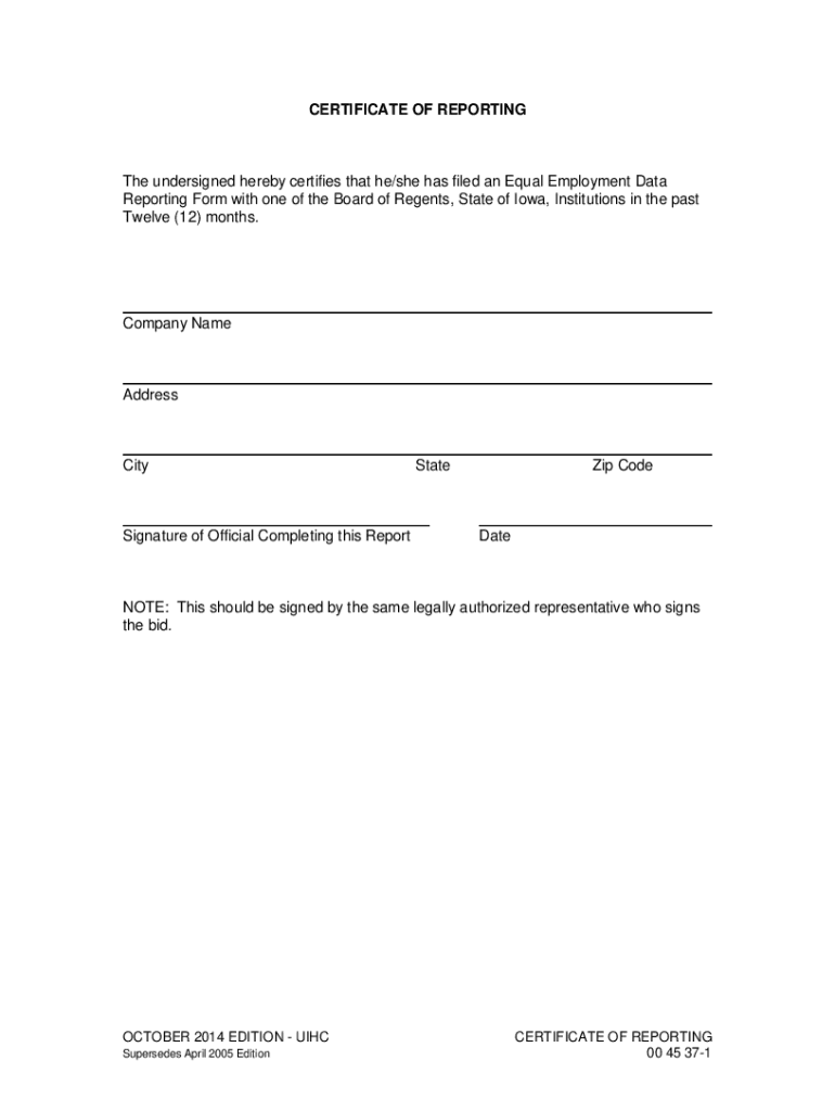 CERTIFICATE OF Reporting undersigned hereby certifies that he/she has filed an Equal Employment Data Reporting Form with one of the Board of Regents, State of Iowa, Institutions in the past Twelve