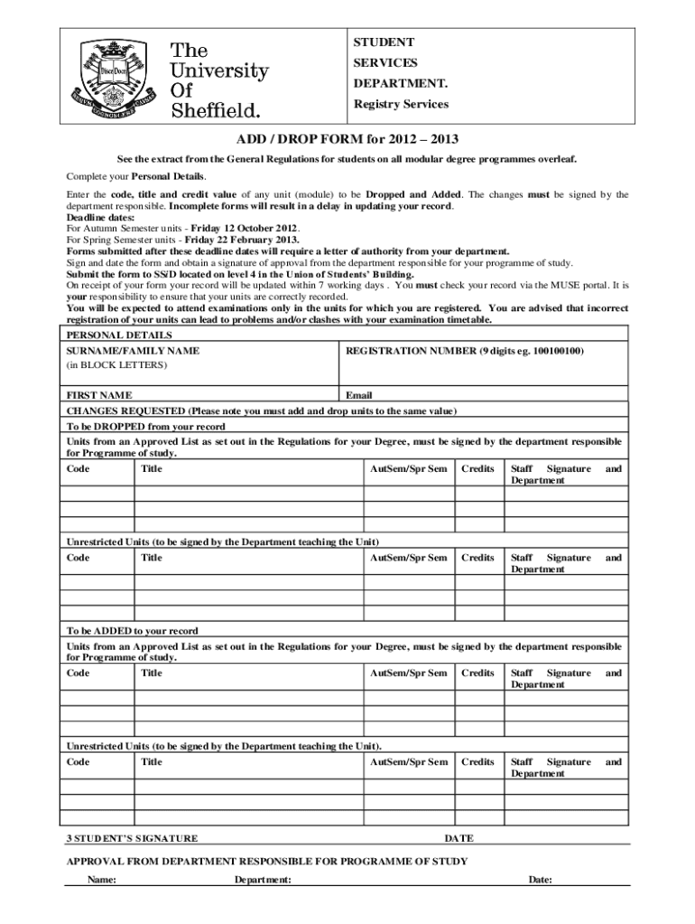 Get the free ADD / DROP FORM for 2012 2013 - University of Sheffield