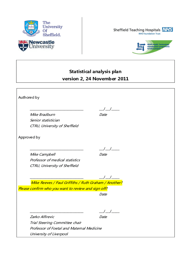 Statistical analysis plan version 2, 24 November 2011Authored by / / Mike BradburnDateSenior statistician CTR, University of Sheffield Approved by / / Mike CampbellDateProfessor of medical statistics