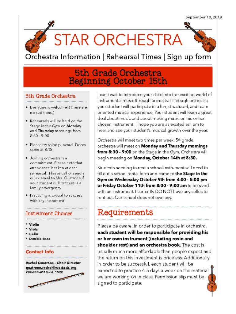 September 10, 2019STAR ORCHESTRA Information Rehearsal Times Sign up form5th Grade Orchestra Beginning October 15th 5th Grade Orchestra Everyone is welcome! (There are no auditions.) Rehearsals will
