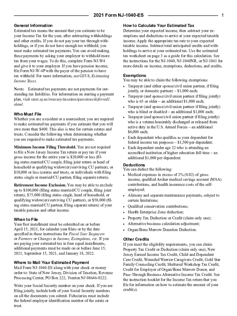 ES 2021 Form NJ1040ES General Information Estimated tax means the amount that you estimate to be your Income Tax for the year, after subtracting withholding and other credits. If you do not pay your